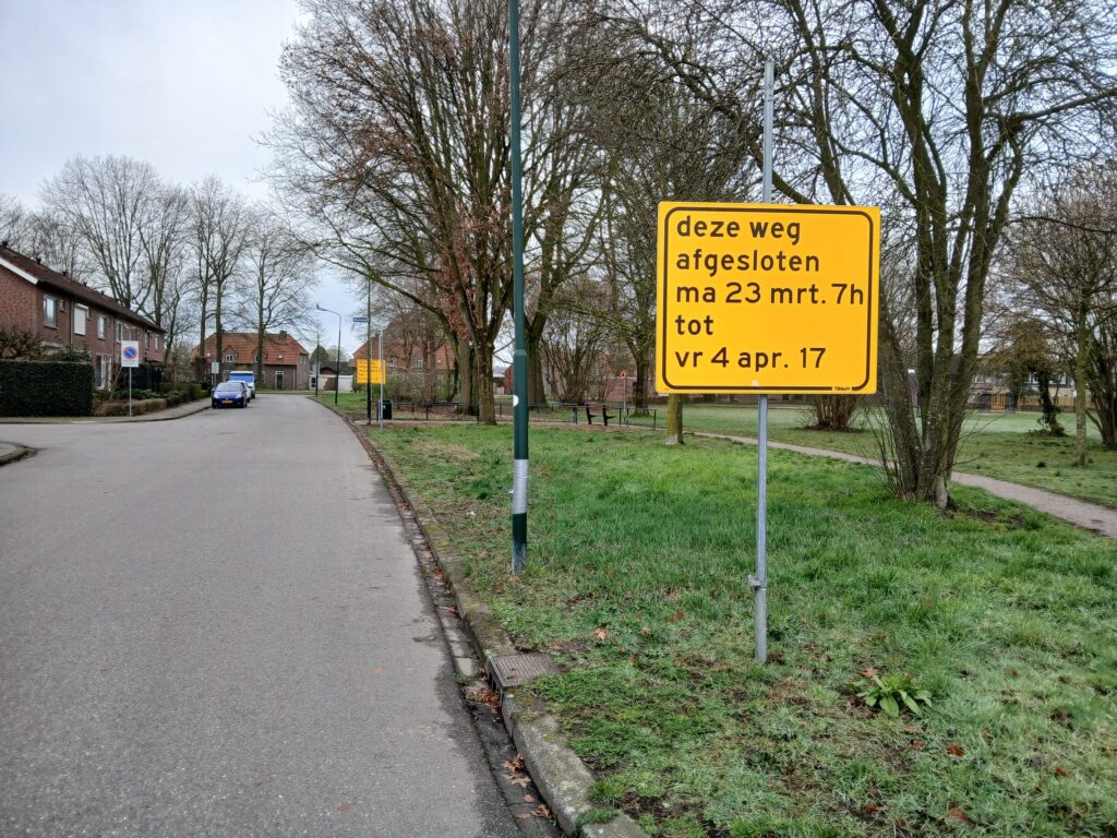 Onlangs verschenen in de Antoon Coolenstraat borden waarop te lezen is dat de straat van maandag 23 maart tot vrijdag 4 april afgesloten zal zijn.