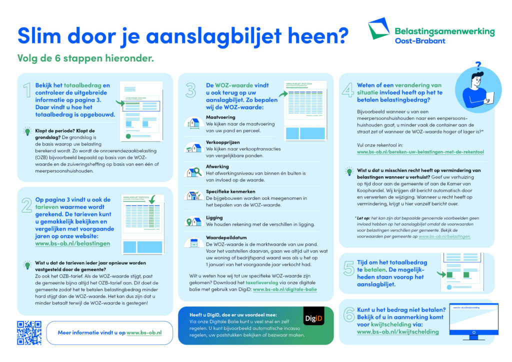 Op de aanslag ziet u de bedragen voor de verschillende belastingsoorten zoals bijvoorbeeld de afvalstoffenheffing. U krijgt ook informatie over hoe u kunt betalen, kwijtschelding kunt aanvragen of bezwaar kunt maken. Op www.bs-ob.nl vindt u meer informatie. Ook vindt u daar de Digitale Balie waar u veel zaken zelf kunt regelen. Komt u er niet uit? Bel BSOB dan via 088 – 551 0000 of vul het contactformulier in op de website. Zij helpen u graag.