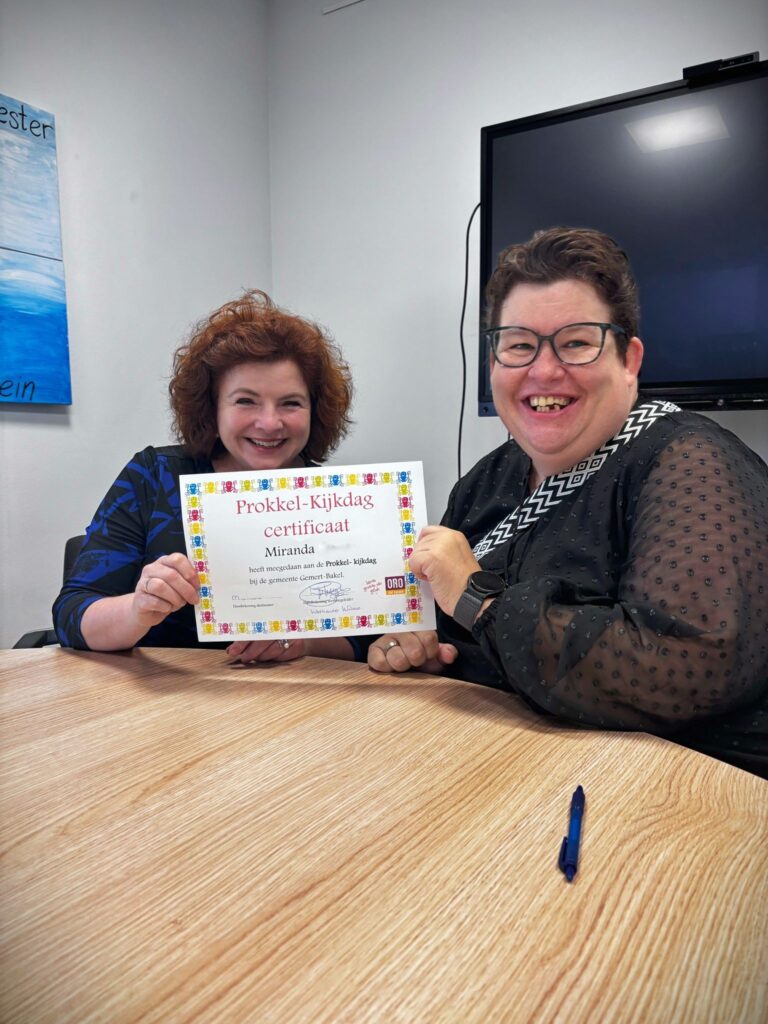 Samen met wethouder Wilmie Steeghs maakte ze een rondje door het gemeentehuis. Zo mocht Miranda ook even meelopen met de bodes. Als feestelijke afsluiter schoof Miranda aan bij de lunch met het college van burgemeester en wethouders. Tijdens deze gezellige afsluiting ontving ze haar certificaat voor het succesvol afronden van haar prokkelstage.