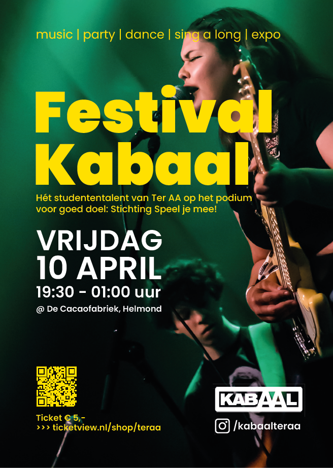 Op vrijdag 10 april vindt in De Cacaofabriek in Helmond de zeventiende editie van festival KabAAL plaats. Dit benefietfestival van Ter AA biedt een podium aan (oud-)studenten, docenten en medewerkers. Ze laten graag zien dat ze méér kunnen dan leren, werken en lesgeven. Bij Ter AA krijg je namelijk de ruimte om je talenten te ontwikkelen in de breedste zin van het woord. Zo’n twintig deelnemers uit de regio laten hun muzikale talent zien met optredens variërend van pop en rock tot rap, bands en singer-songwriters. KabAAL is uitgegroeid tot het drukst bezochte evenement van Ter AA én steunt tegelijkertijd het goede doel. De volledige opbrengst van het festival gaat naar Stichting Speel je mee.