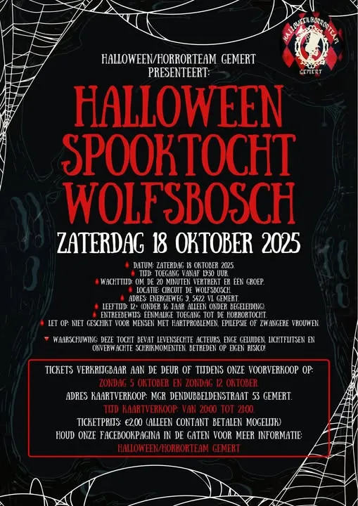 Op zaterdag 18 oktober een Halloween Spooktocht Wolfsbosch te Gemert. Startpunt Energieweg 9 te Gemert.