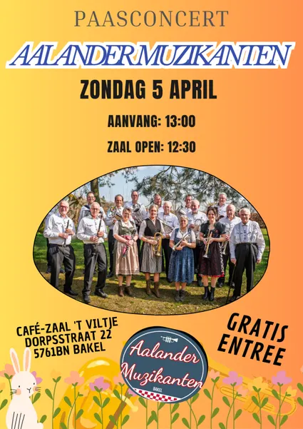 Op eerste paasdag, zondag 5 april, geven de Aalander Muzikanten hun jaarlijkse paasconcert. Van 13.00 tot 15.00 uur brengen zij in Zaal ’t Viltje een spiksplinternieuw repertoire.