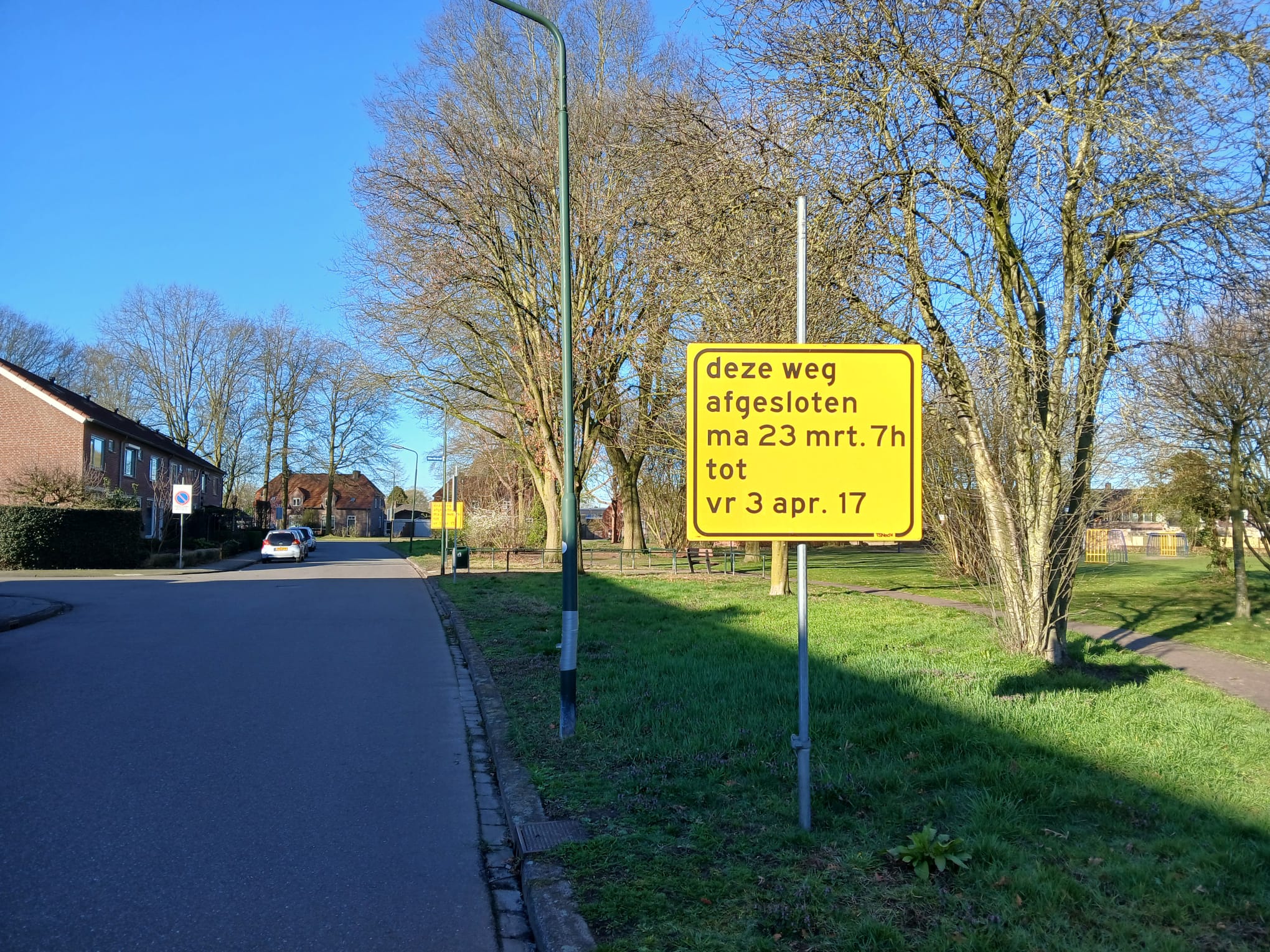 Oplettende lezers maakten ons erop attent dat die vrijdag 3 april was, en niet 4 april. Dat is ook doorgegeven aan de gemeente, die maatregelen nam: Er staan nu nieuwe borden met de juiste datum erop: De straat wordt afgesloten van maandag 23 maart 7.00 uur tot vrijdag 3 april 17.00 uur. Ook mag er dan niet geparkeerd worden.