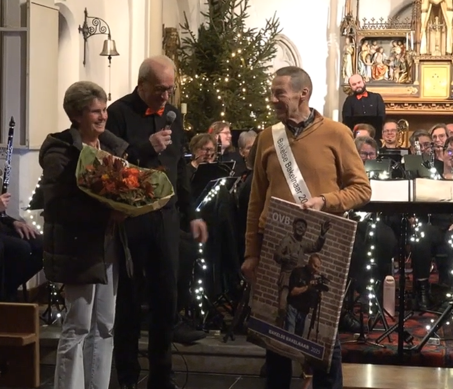 In een volle Willibrorduskerk werd jongstleden zaterdagavond tijdens het Klinkende Kerstconcert van harmonie en slagwerkgroep Musis Sacrum de Bakelse Bakelnaar 2025 bekend gemaakt. Deze eervolle onderscheiding bleek te gaan naar de cameraman die het concert vanuit de preekstoel voor Omroep Centraal TV stond te filmen: Rinus van der Horst.