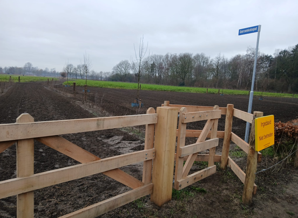 De Stappers vertrokken weer vanaf speeltuin De Wieken rond 14.00 uur en gingen via Molenstraat, Rentmeesterstraat en de tuin achter het gemeentehuis naar de Kasteellaan. Vandaar  liepen we het pad naar het Hopveld in en kwamen uiteindelijk bij het nieuw aangelegde Goorswinkelsepad. Alles was daar vers omgewerkt en – volgens de borden – ingezaaid.